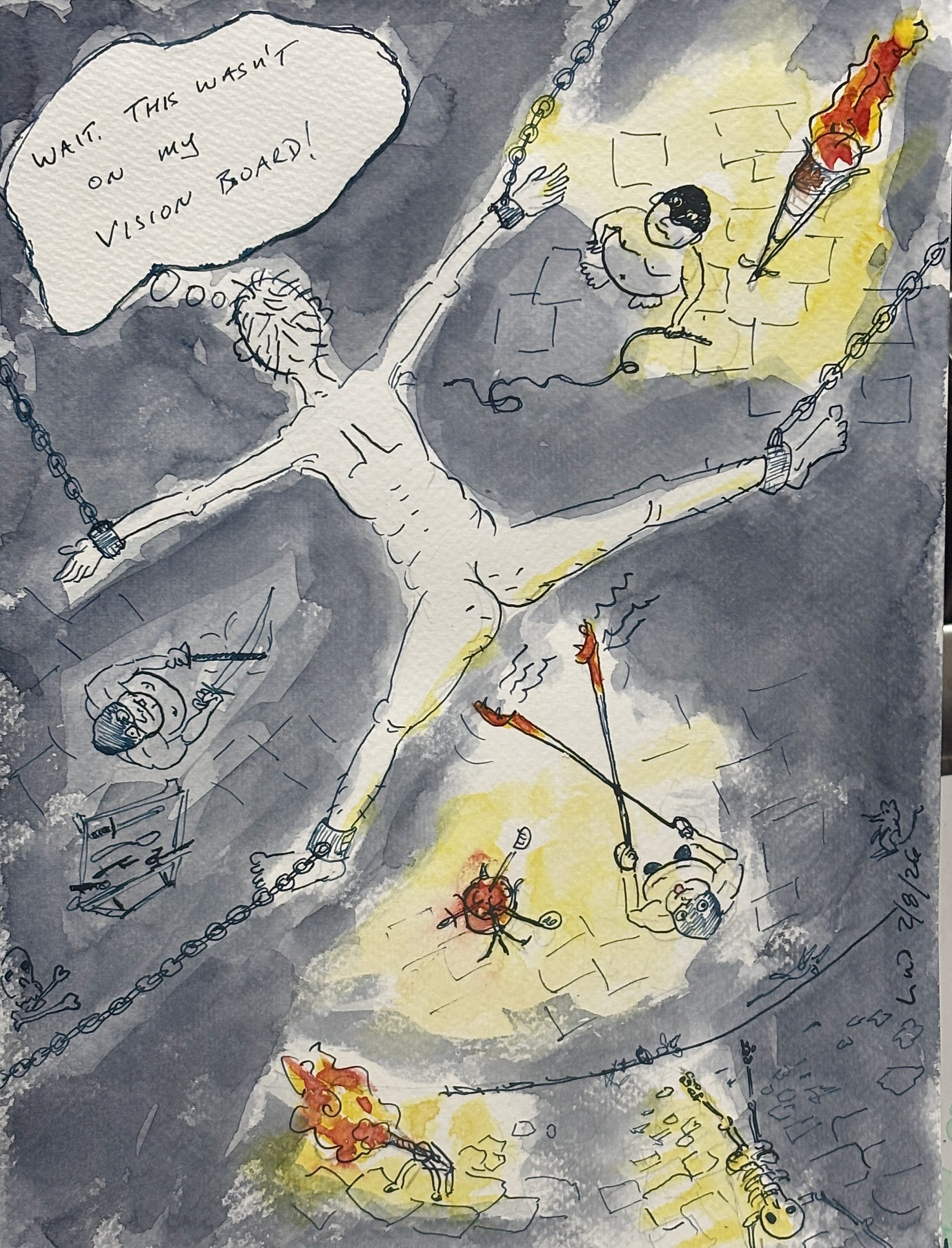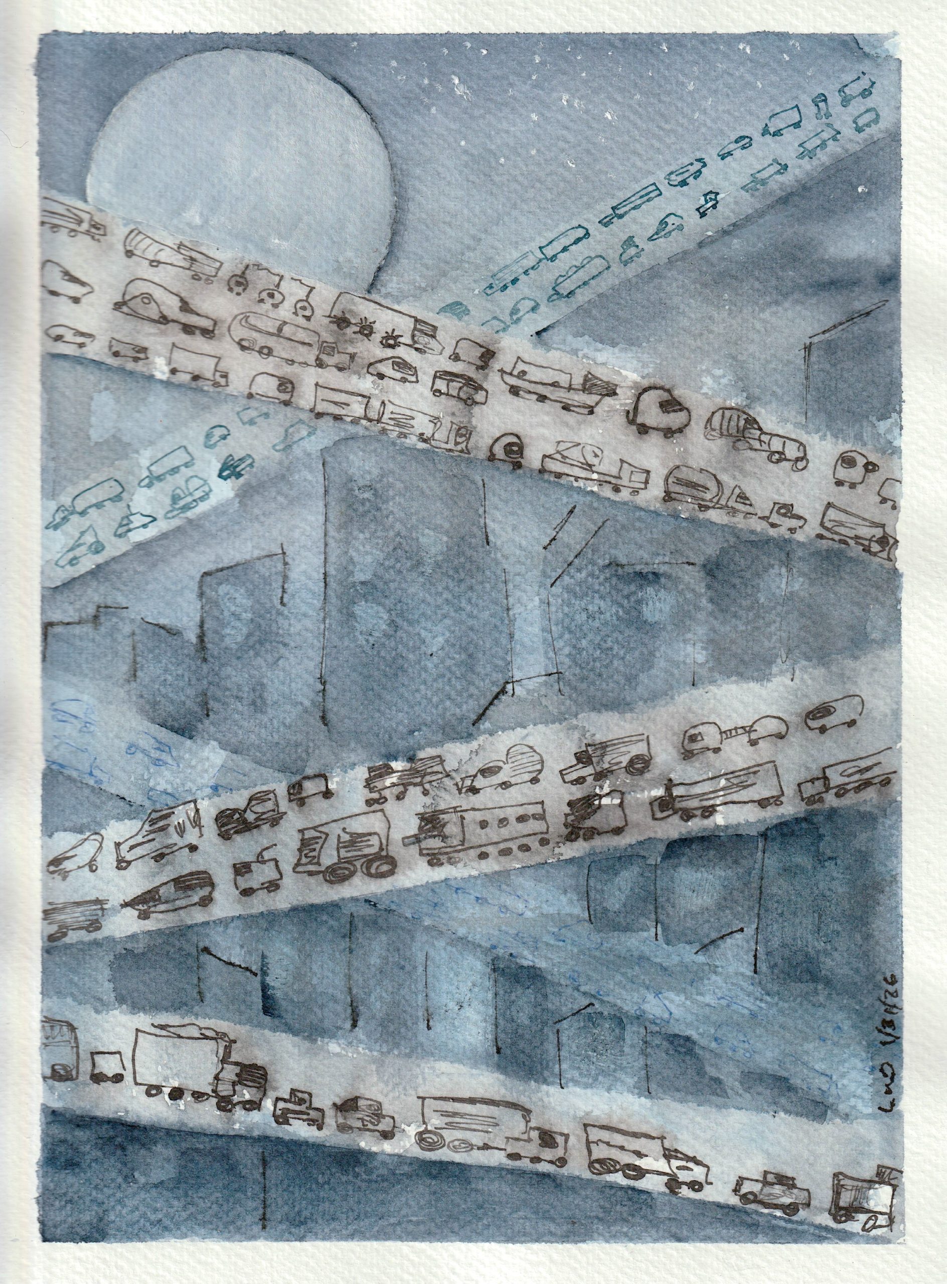 Most of these are very quickly done, and are more of an exercise in getting an idea out quickly than developing a full painting. They’re full of mistakes, which I usually fix by cutting out a piece of paper and gluing it over the offense.